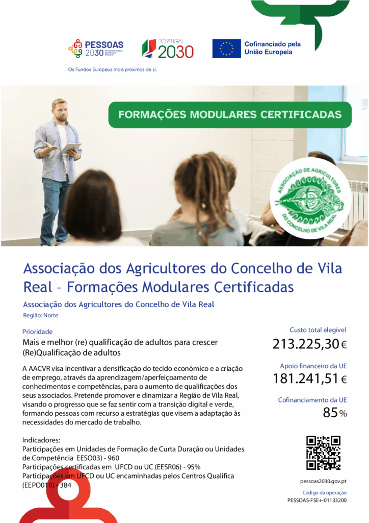 A Operação “Associação dos Agricultores do Concelho de Vila Real – Formações Modulares Certificadas” visa promover o desenvolvimento de Formação Modular Certificada (FMC) do Catálogo Nacional de Qualificações (CNQ), com vista a aumentar qualificações e responder às necessidades formativas dos adultos, tendo por base o seu percurso individual de qualificação e as necessidades do mercado de trabalho.